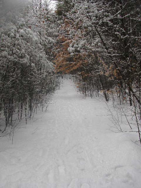 Looking up the likely rope tow lift line, with a very overgrown slope on the left. |