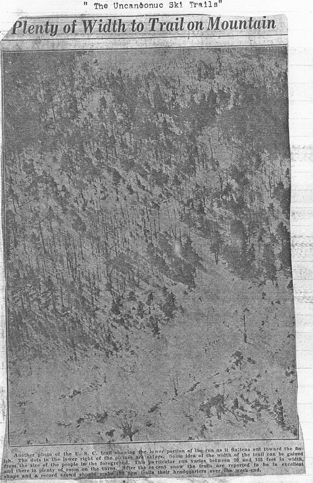 Don Guyer remembers skiing here: Skiing on Uncanoonuc in the thirties and forties meant either a long walk up the slope or, if the train was running, a short ride to the top. There were only 3 important trails that I remember, but if they were named, I'm not sure.