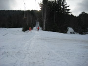 | Skiers loading the T-bar. | Riding the T-bar, upper section. |